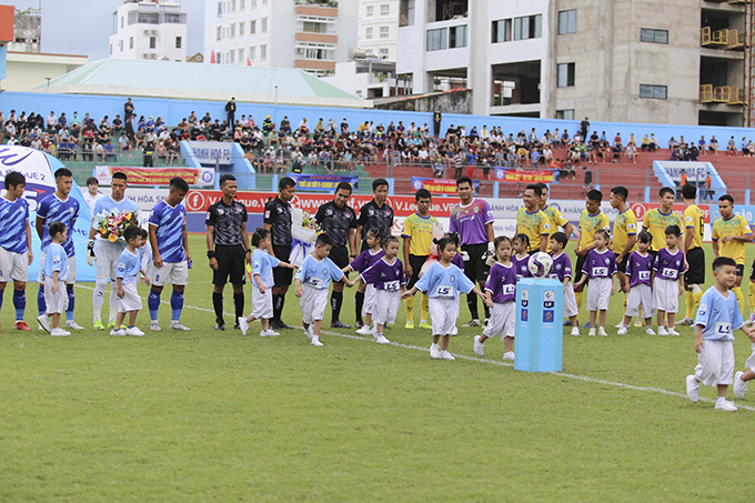 Hai đội Khánh Hòa FC và Cần Thơ làm thủ tục trước trận đấu.