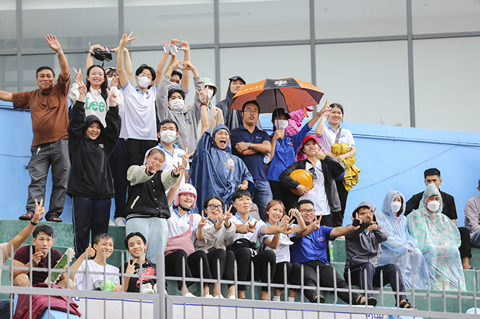 Trời mưa nhưng khán giả vẫn kiên nhẫn ngồi xem hai đội đấu.