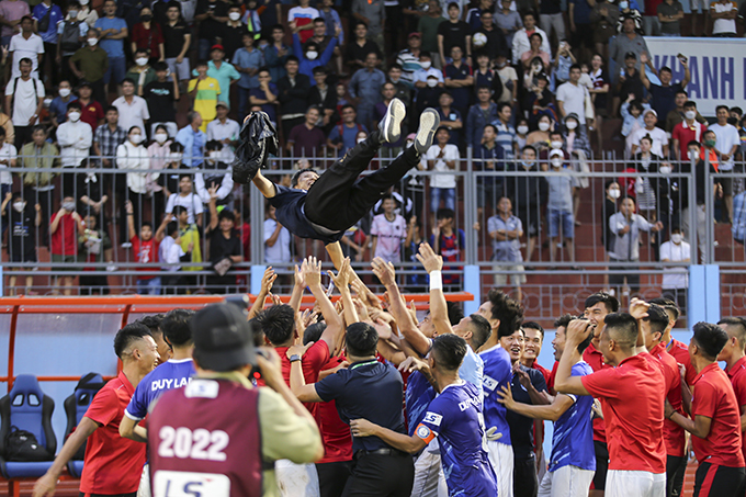 Các cầu thủ Khánh Hòa FC vui mừng cùng huấn luyện viên Võ Đình Tân.
