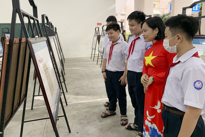 Giáo viên, học sinh Trường THCS Trần Nhật Duật xem hình ảnh triển lãm. |
