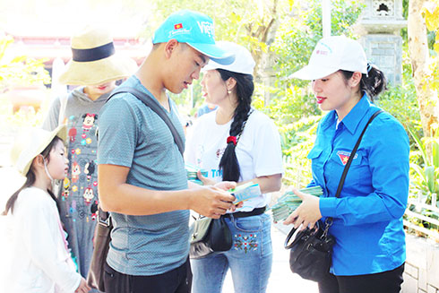 Đoàn viên Chi đoàn Sở Du lịch tuyên truyền và phát Bộ Quy tắc ứng xử văn minh du lịch cho du khách đến tham quan chùa Long Sơn. |
