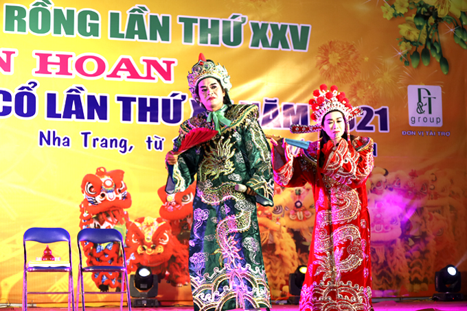 Vợ chồng Nghệ nhân Ưu tú Văn Bảy - Kim Chi cùng biểu diễn một trích đoạn bài chòi dân gian. |