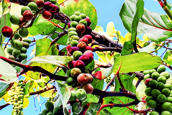 Những cây nho biển do phải chịu đựng với những cơn gió liên tục thổi vào từ biển nên cây cứ nương theo uốn cong mình. Lá nho biển khi còn non, có người đã nghĩ ra việc hái đem về để cuốn thịt, cuốn cá nướng, nhưng khi già chúng rất dày như để đối phó với sự khắc nghiệt của thiên nhiên. Đó là lý do tại sao nho biển được trồng ven biển, ngoài mục đích để tạo cảnh quan, còn là một nét đẹp vô cùng khác lạ.