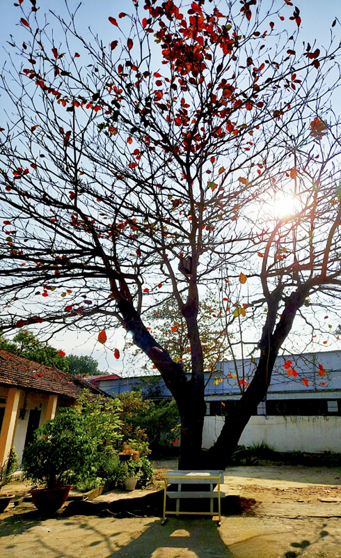 Trường cũ xập xệ, hoang vu nhưng hai cây bàng thì ngược lại lừng lững cao to, rợp bóng xuống mảnh sân trường. Lá bàng rơi vương vãi bên hiên, chen chúc xếp lớp trên nền đất nện. Gió thổi lộng. Rào rào; thêm dăm chiếc lá vàng/đỏ lại lìa cành, lăn lăn trên mặt đất. Bất giác tôi, cô học trò cũ, không biết nghĩ sao lại chạy sang nhà bên mượn cây chổi về khom lưng quét tới quét lui. Tôi quét sạch hết cả thềm sân, gom đống lá bàng lại một nơi xong đi xin lửa về đốt. Ngọn lửa chầm chậm cháy lan, tỏa khói lắt lay trong không gian chiều dường nghe rón rén thực hư bao bước chân hoài niệm. Chỉ vậy thôi mà lòng đã thấy ấm. Tôi đứng trong sân trường nhìn khắp lượt lần cuối rồi vẫy tay chào tạm biệt hai cây bàng. Tự nhiên tôi thấy nhớ thầy Tiến da diết. Thầy ơi, học trò của thầy hôm nay về thăm trường cũ. Trường còn, hai cây bàng còn mà thầy giờ nơi đâu…