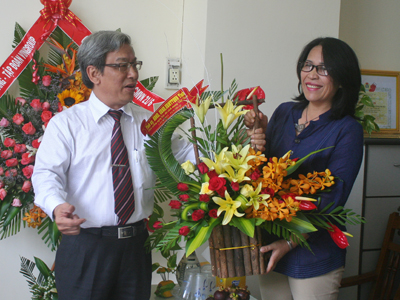 Ông Lê Xuân Thân tặng lẵng hoa cho lãnh đạo Văn phòng đại diện Báo Lao động tại Khánh Hòa. |