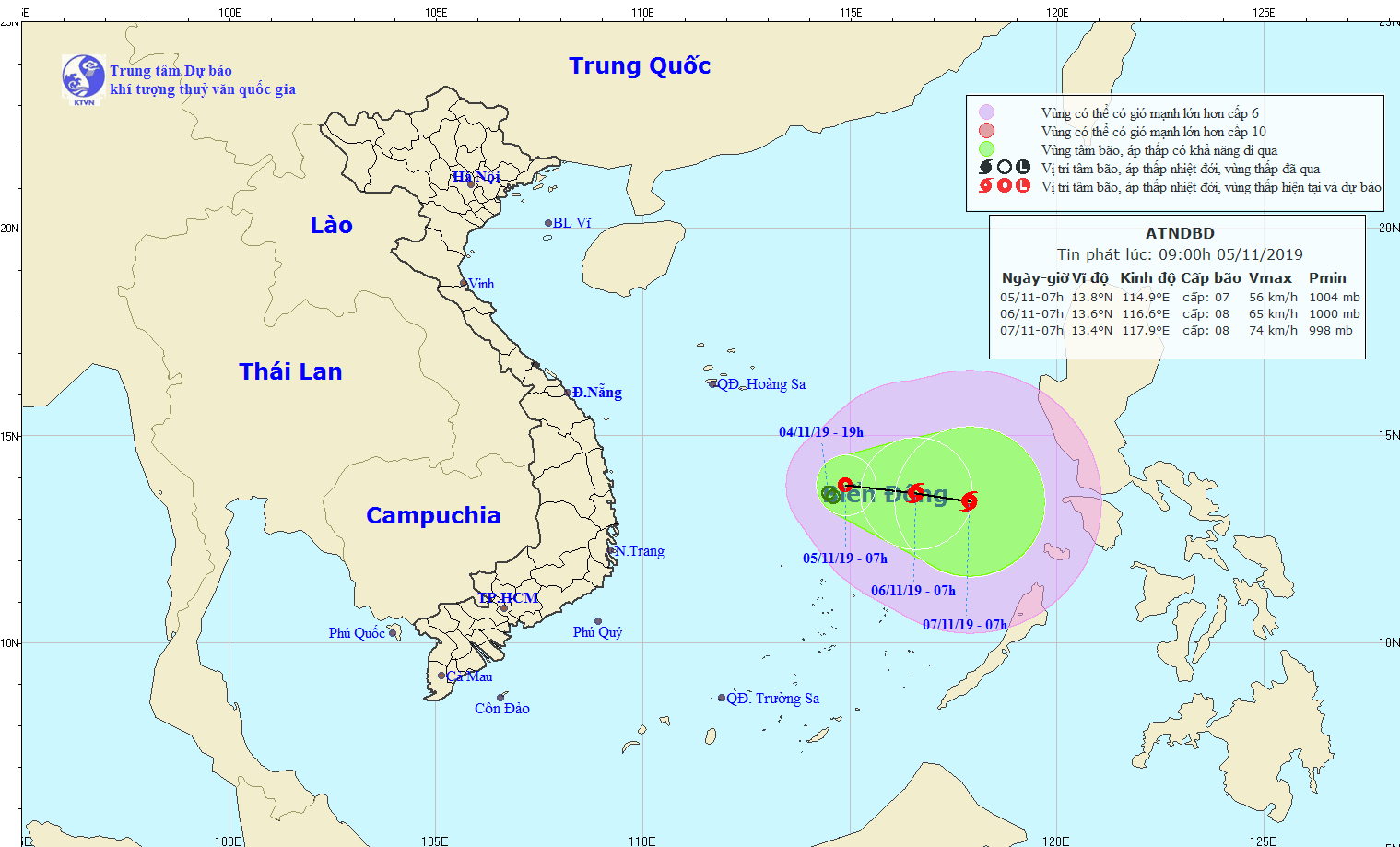 Theo Đài Khí tượng thủy văn Nam Trung bộ, hồi 7 giờ ngày 5-11, vị trí tâm áp thấp nhiệt đới ở vào khoảng 13,8 độ Vĩ Bắc; 114,9 độ Kinh Đông, cách đảo Song Tử Tây (quần đảo Trường Sa) khoảng 250km về phía Bắc. Sức gió mạnh nhất vùng gần tâm áp thấp nhiệt đới mạnh cấp 6-7 (40-60km/giờ), giật cấp 9. Bán kính gió mạnh cấp 6, giật cấp 8 trở lên khoảng 70km tính từ tâm áp thấp nhiệt đới.