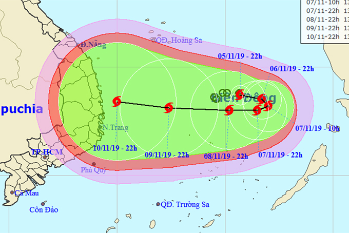 Dự báo trong 24 giờ tới, bão di chuyển chậm về phía Đông, mỗi giờ đi được khoảng 5km và có khả năng mạnh thêm. Đến 22 giờ ngày 6-11, vị trí tâm bão ở khoảng 13,5 độ Vĩ Bắc; 116,7 độ Kinh Đông, cách đảo Song Tử Tây khoảng 340km về phía Đông Bắc. Sức gió mạnh nhất vùng gần tâm bão mạnh cấp 9 (75-90km/giờ), giật cấp 11.