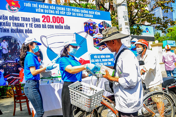 Ngày 6-2, Tỉnh đoàn tổ chức cấp phát khẩu trang miễn phí cho người dân tại số 6 Hoàng Hoa Thám (TP. Nha Trang). Mỗi người có thể nhận được 2 khẩu trang miễn phí tại đây. Anh Bùi Hoài Nam - Bí thư Tỉnh đoàn cho biết, nhằm chia sẻ, giúp đỡ người dân phòng, chống dịch, Tỉnh đoàn đã kêu gọi, vận động tài trợ từ các doanh nghiệp, mạnh thường quân trên địa bàn tỉnh. Qua số khẩu trang được hỗ trợ, Tỉnh đoàn phát miễn phí cho mọi người dân vào các khung giờ: 9 đến 10 giờ; 16 đến 17 giờ mỗi ngày. Đến nay, Tỉnh đoàn đã kêu gọi các đơn vị ủng hộ kinh phí mua được hơn 3.000 khẩu trang tại các địa chỉ cung cấp tin cậy do Bệnh viện Đa khoa tỉnh giới thiệu.