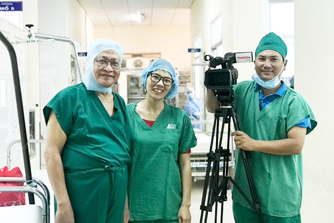 Phóng viên Thảo Ly (giữa) và đồng nghiệp trong lần tác nghiệp tại Bệnh viện Đa khoa tỉnh. |