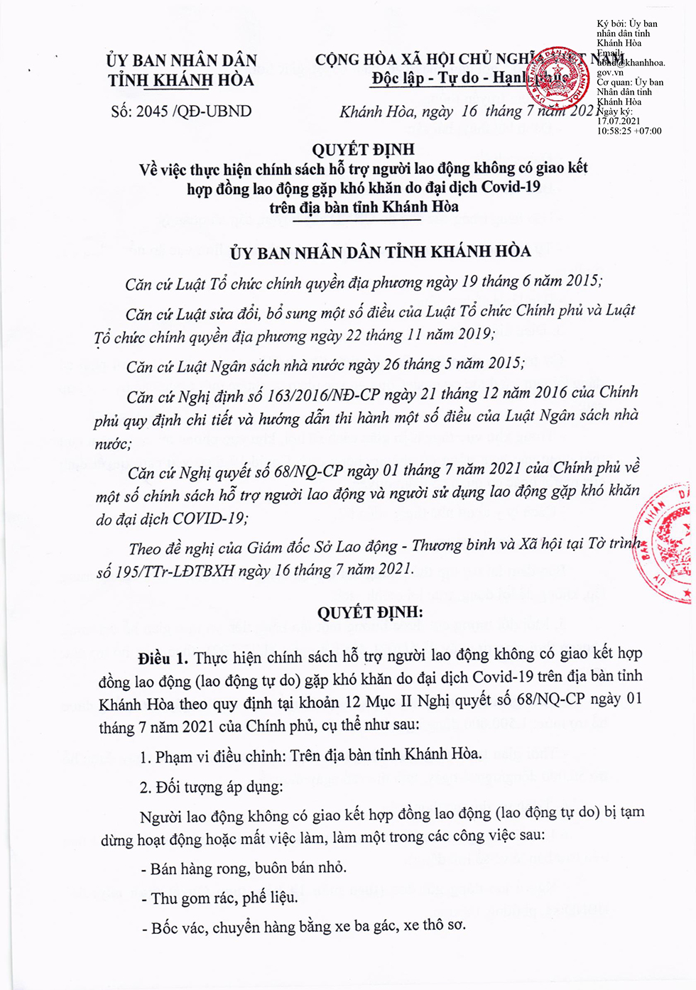 UBND tỉnh Khánh Hòa vừa ban hành Quyết định về việc thực hiện chính sách hỗ trợ người lao động không có giao kết hợp đồng lao động (lao động tự do) gặp khó khăn do đại dịch Covid-19 trên địa bàn tỉnh theo Nghị quyết số 68 của Chính phủ.