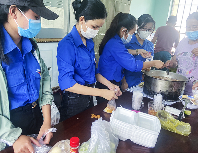 Hỗ trợ chuẩn bị thức ăn tiếp tế cho các trường hợp khó khăn trong khu phong tỏa. |