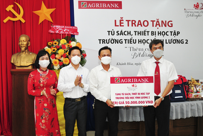 Lãnh đạo Agribank Chi nhánh tỉnh Khánh Hòa (bìa phải) trao biểu trưng hỗ trợ cho Trường Tiểu học Vĩnh Lương 2. |