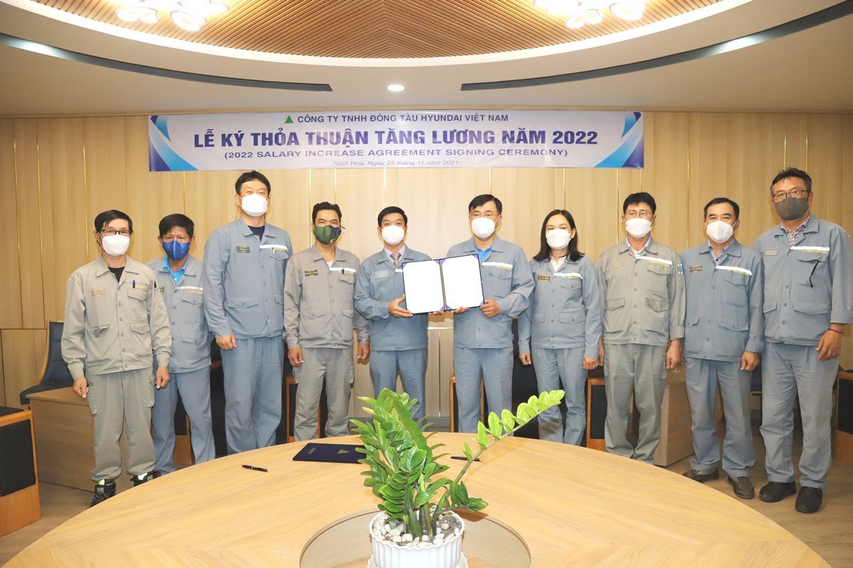 Ngày 25-11, lãnh đạo Công ty TNHH Đóng tàu Hyundai Việt Nam (HVS) và Ban Chấp hành Công đoàn cơ sở công ty đã ký thỏa thuận tăng lương năm 2022 cho người lao động.