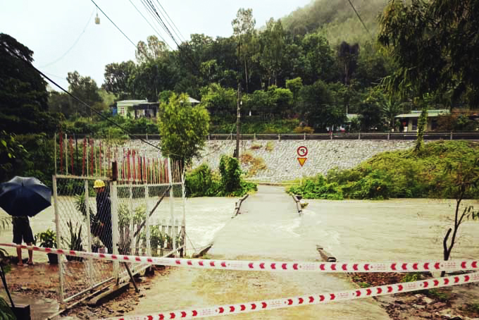 Ông Lương Nguyễn Nhật Trường - Trưởng phòng Nông nghiệp và Phát triển Nông thôn, Phó Trưởng Ban Chỉ huy PCTT-TKCN huyện Khánh Vĩnh cho biết, do mưa lớn kéo dài từ tối 10-11, nước sông dâng cao nên sáng 11-11, một số cầu tràn trên địa bàn huyện đã bị ngập, như: Cầu Thác Ngựa (từ thị trấn Khánh Vĩnh đi xã Khánh Nam); cầu Sông Trang (từ xã Liên Sang đi xã Giang Ly - Khánh Thượng); các cầu Yangbay 1, Yangbay 2, Yangbay 3 của xã Khánh Phú; cống 3 giáp Tỉnh lộ 2 thuộc xã Sông Cầu... Tại các điểm ngập, các địa phương đã cử lực lượng dân quân trực chốt, hướng dẫn người dân lưu thông bằng đường qua cầu treo. Trên Quốc lộ 27C (đường Nha Trang - Đà Lạt), đoạn km 41+300 đèo Khánh Lê, qua xã Sơn Thái xảy ra sạt lở gây tắc đường hoàn toàn, khối lượng ước khoảng 9.000m3. Ngoài ra, tại km55+500 cũng bị sạt lở nhẹ, nhưng do khu vực này nước chảy siết, nhà thầu cắt cử lực lượng để bảo đảm an toàn cho người giao thông.