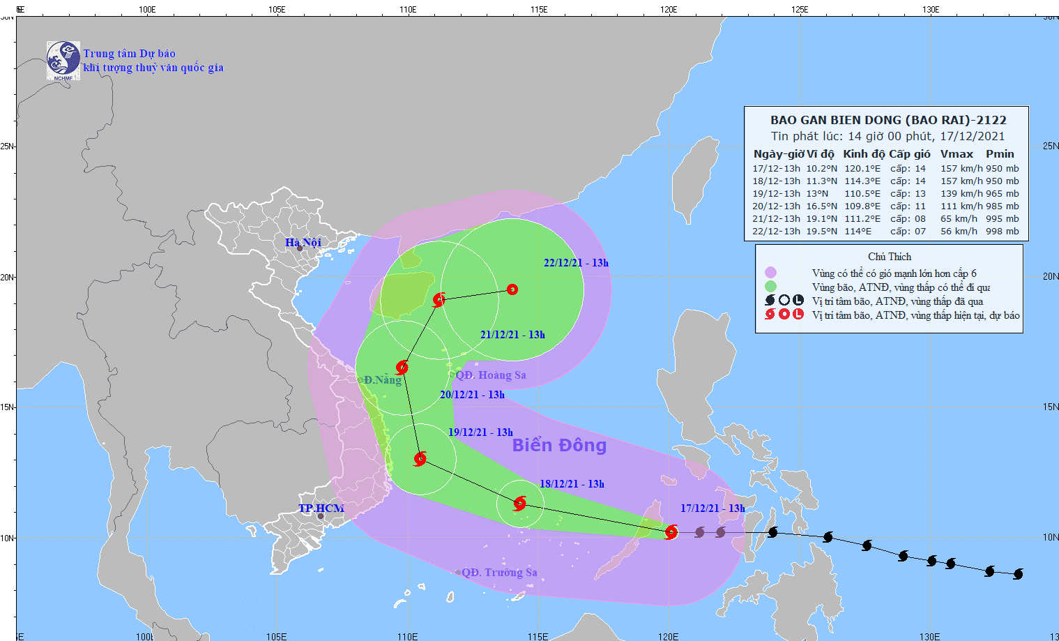 Hồi 13 giờ ngày 17/12, vị trí tâm bão ở khoảng 10,2 độ Vĩ Bắc; 120,1 độ Kinh Đông, ngay trên vùng biển phía Đông Bắc đảo Pa-la-oan (Phi-líp-pin). Sức gió mạnh nhất vùng gần tâm bão mạnh cấp 14 (150-165km/giờ), giật cấp 17.