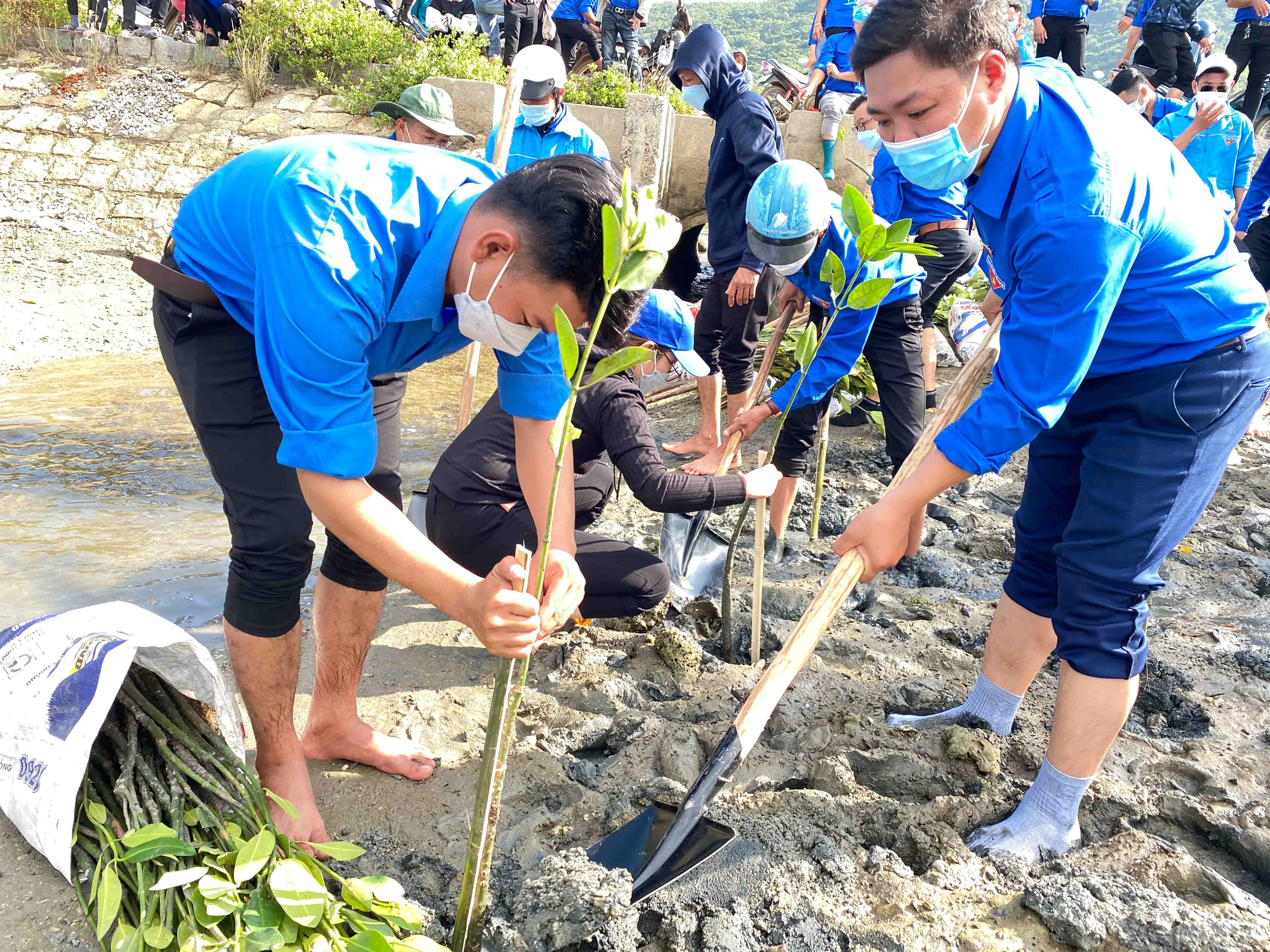 Sau lễ khởi động, các đoàn viên, thanh niên ra quân trồng 1.500 cây đước tại xã Ninh Phú |