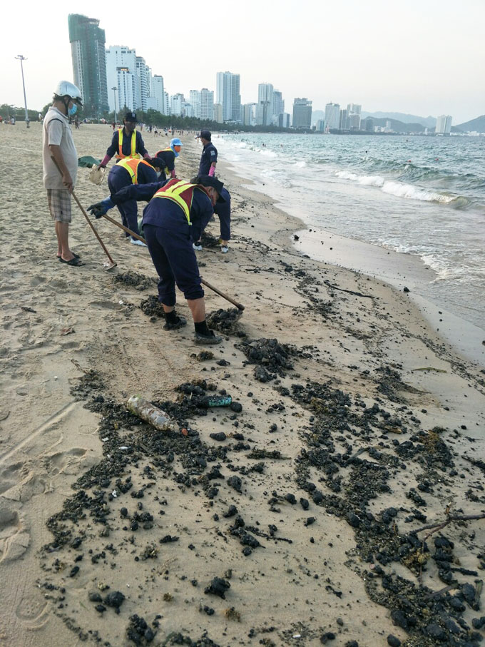Chiều 17-3, ông Huỳnh Bình Thái, Trưởng Ban quản lý vịnh Nha Trang cho biết, các đơn vị chức năng đang tiến hành thu gom hàng tấn dầu vón cục dạt vào bãi biển trải dài từ cuối Công viên Bạch Đằng (phường Vĩnh Nguyên) tới Khu nghỉ dưỡng Evason Ana Mandara Nha Trang (phường Lộc Thọ), để đưa đi xử lý. Ngoài khu vực này, tại Hòn Mun, lực lượng chức năng cũng phát hiện lượng lớn dầu vón cục bị sóng đánh dạt vào đảo, ảnh hưởng xấu đến môi trường.