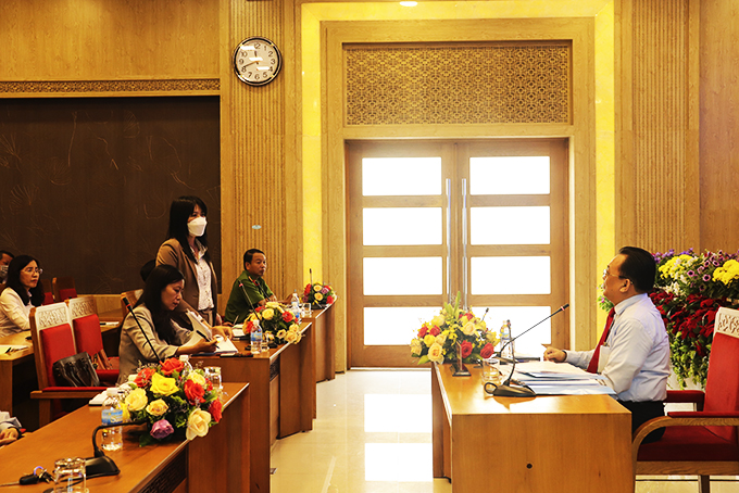 Ông Lê Hữu Hoàng nghe đại biểu phát biểu ý kiến tại hội nghị. |