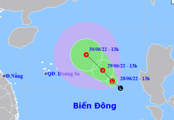 Theo bản tin của Trung tâm dự báo khí tượng thủy văn Quốc gia, hồi 13 giờ ngày 28-6, vùng áp thấp trên biển Đông cách quần đảo Hoàng Sa khoảng 650km về phía Đông Đông Nam.