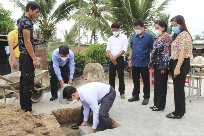 Lãnh đạo Báo Khánh Hòa và Tổng Công ty Khánh Việt động thổ khởi công xây nhà tình nghĩa cho gia đình ông Moong Văn Nhuần. |