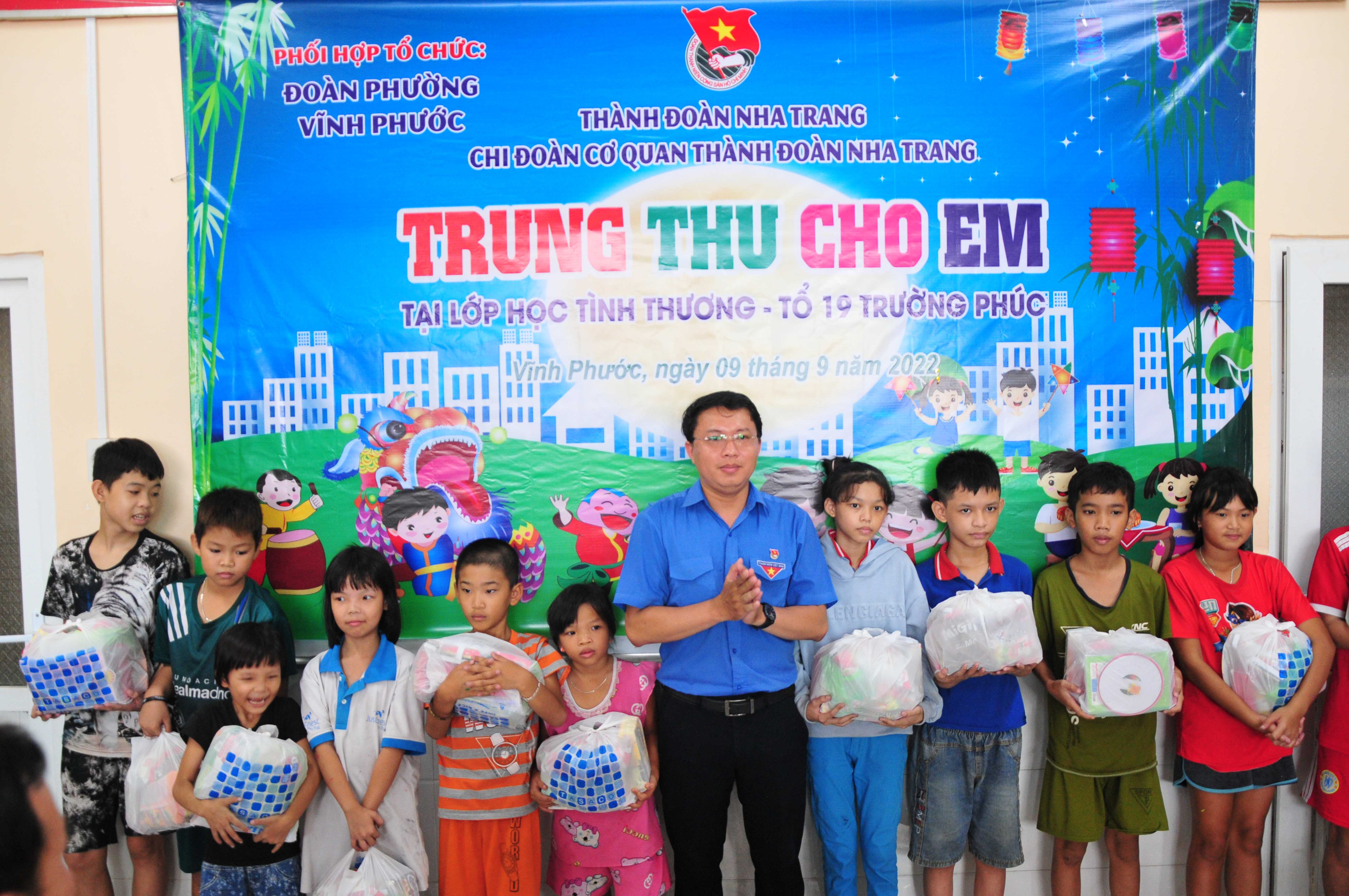 Tại đây, các học sinh của lớp học tình thương được tham gia các hoạt động sôi nổi như vẽ trang trí mặt nạ, xem biểu diễn múa lân. Bên cạnh đó, Chi đoàn cơ quan Thành đoàn Nha Trang trao 45 suất quà gồm bút, vở, bánh kẹo, lồng đèn Trung thu cho các thiếu nhi, trị giá 200 nghìn đồng/phần quà.