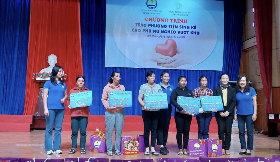 Sáng 26-10, Hội Liên hiệp Phụ nữ tỉnh Khánh Hòa phối hợp Hội Doanh nhân nữ tỉnh tổ chức chương trình “Trao phương tiện sinh kế cho phụ nữ nghèo vượt khó” trên địa bàn thị xã Ninh Hòa. Theo đó, tại chương trình, Ban tổ chức đã trao 5 phương tiện sinh kế cho 5 hội viên có hoàn cảnh khó khăn, mỗi người 7,2 triệu đồng (bao gồm phương tiện sinh kế, vốn và quà tặng); trao 90 phần quà cho 90 hội viên nghèo với tổng tiền hơn 20 triệu đồng.