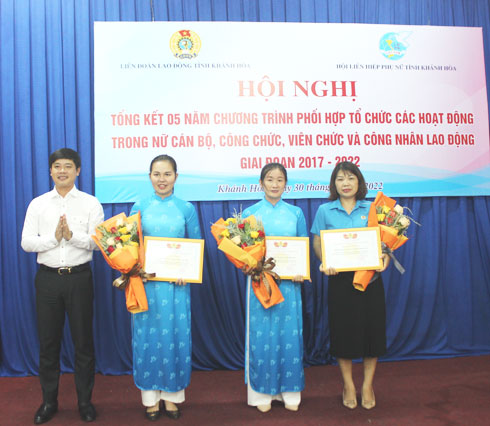 Nhân dịp này, Liên đoàn Lao động tỉnh và Hội Liên hiệp phụ nữ tỉnh tặng bằng khen cho 6 tập thể và 6 cá nhân có thành tích xuất sắc trong triển khai chương trình phối hợp giai đoạn 2017 - 2022.