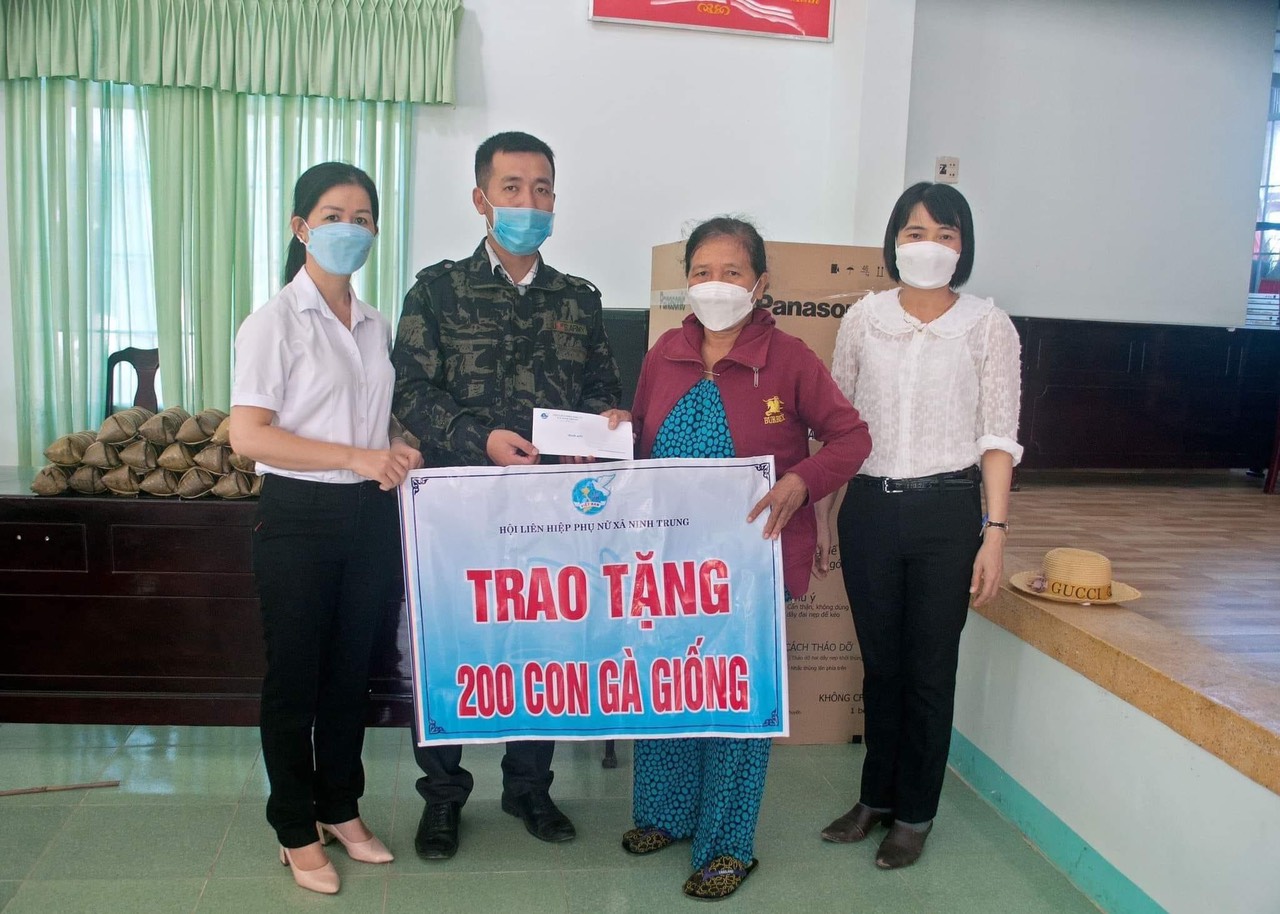 Hội Phụ nữ xã Ninh Trung (thị xã Ninh Hòa, tỉnh Khánh Hòa) vừa phối hợp với mạnh thường quân trao 200 con gà giống cho chị Trần Thị Nờ với tổng trị giá 5 triệu đồng. Chị Nờ bị khuyết tật ở chân, gia đình khó khăn, chồng chị cũng là đôi tượng thương bệnh binh, bậc 3/4.
