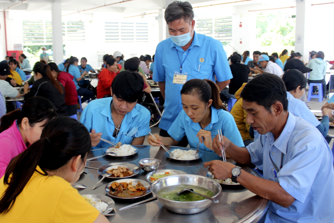Cán bộ công đoàn kiểm tra, giám sát bữa ăn ca của công nhân ở Khu công nghiệp Suối Dầu. |