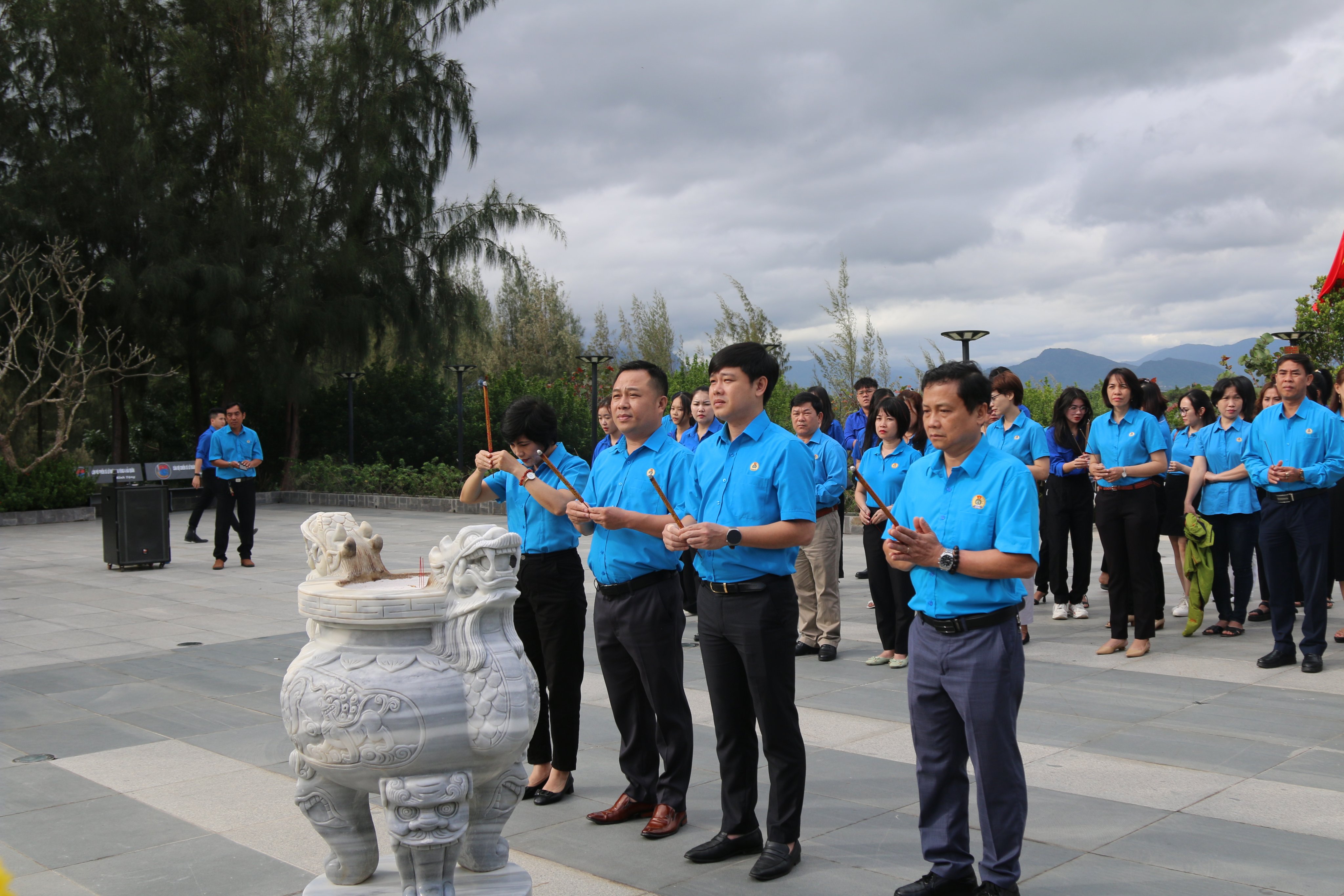 Tại Cụm tượng đài “Những người nằm lại phía chân trời”, gần 100 cán bộ công đoàn đã dâng hoa, dâng hương và dành một phút mặc niệm tưởng nhớ các anh hùng, liệt sĩ đã hy sinh trong sự nghiệp bảo vệ chủ quyền thiêng liêng biển, đảo của Tổ quốc.