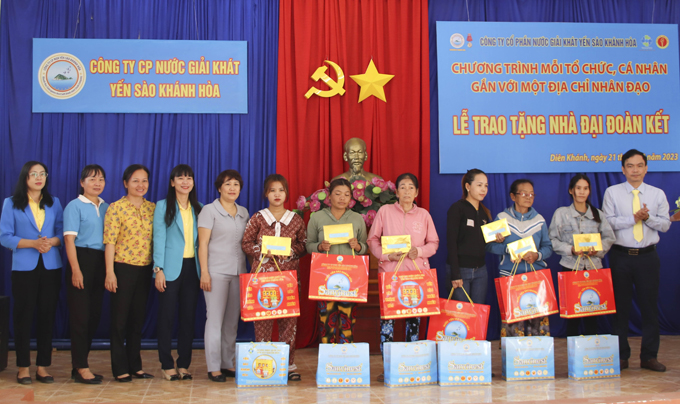 Đây là 3 trong tổng số 5 căn nhà đại đoàn kết mà công ty trao tặng cho người dân trên địa bàn huyện Diên Khánh năm 2023. Mỗi căn nhà do Công ty Cổ phần Nước giải khát Yến sào Khánh Hòa trao tặng có diện tích từ 40m2 trở lên, lợp tôn, lót gạch bông với trị giá 70 triệu đồng/căn. Ngoài ra, công ty cũng trao tặng các gia đình vật dụng như ti vi, đồng hồ treo tường và các sản phẩm từ yến sào với tổng trị giá 30 triệu đồng. Tiền xây nhà cũng như quà tặng được trích trong quỹ phúc lợi của công ty do người lao động đóng góp hàng tháng. Với mong muốn được chia sẻ khó khăn, giúp đỡ bà con có được cuộc sống ấm no, hạnh phúc hơn, nhân dịp này công ty cũng tiến hành trao tặng 20 suất quà cho 20 phụ nữ vượt khó của xã Diên Đồng, mỗi suất quà trị giá 1 triệu đồng.