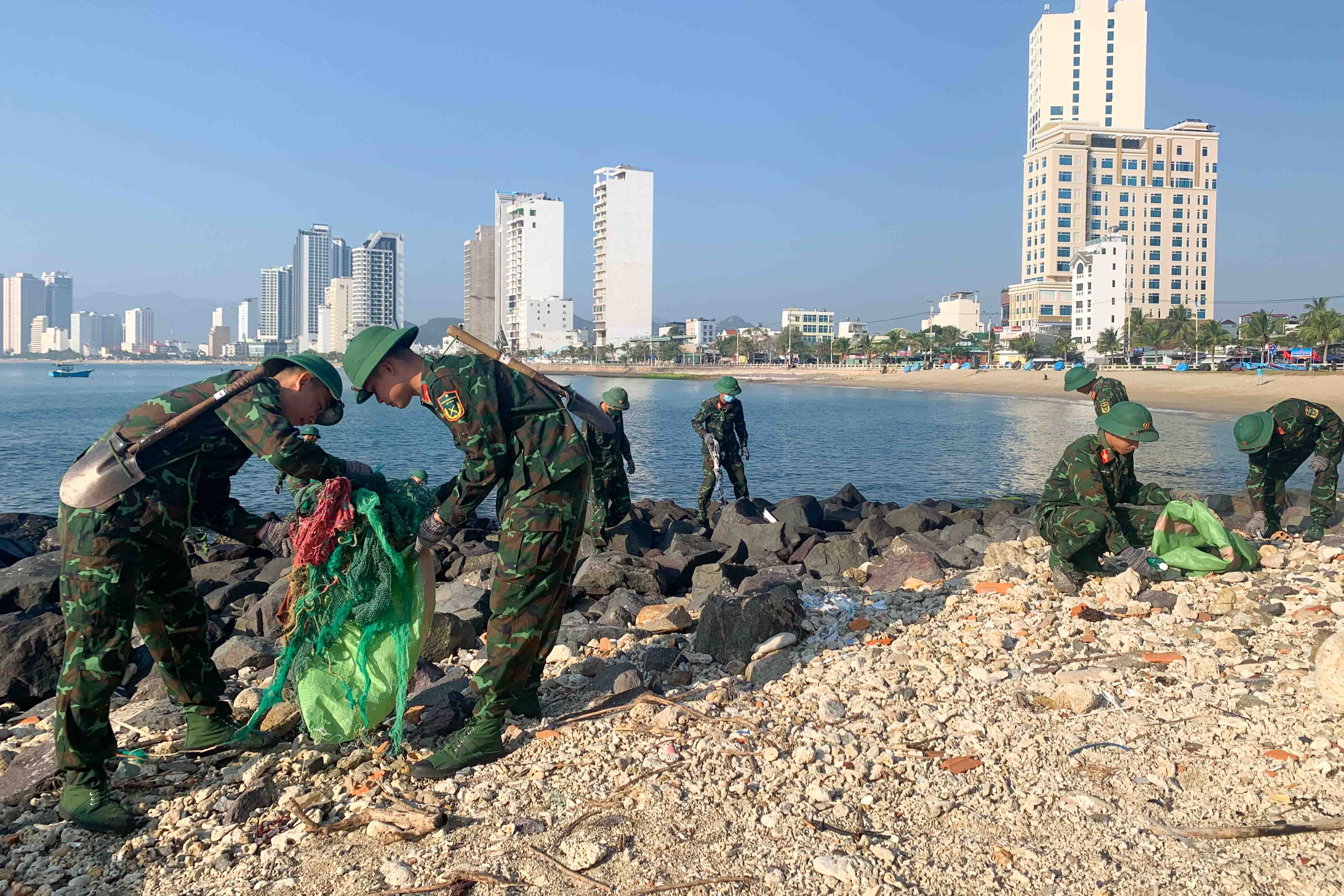 Hơn 100 cán bộ, đoàn viên, thanh niên Trường Sĩ quan Thông tin và phường Vĩnh Hòa cùng người dân địa phương đã ra quân vệ sinh, thu gom rác thải trên bãi biển, rác thải bị trôi dạt trên mặt nước và các khu vực dân sinh lân cận bãi biển khu vực Hòn Một với chiều dài thực hiện hơn 2km, thu gom được hơn 600kg rác thải.