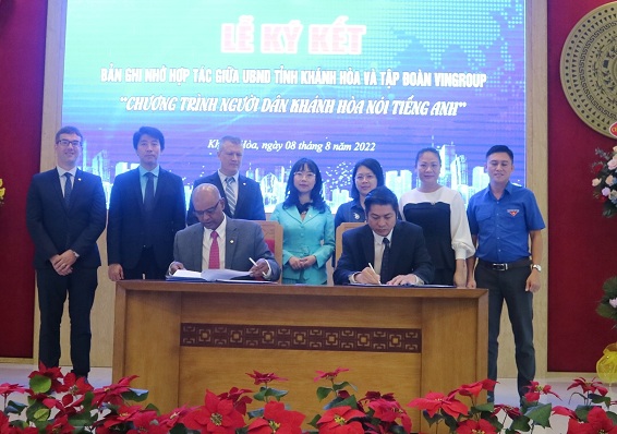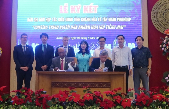 Sáng 8-8, UBND tỉnh Khánh Hòa tổ chức lễ ký kết biên bản ghi nhớ hợp tác với Tập đoàn Vingroup về chương trình “Người dân Khánh Hòa nói tiếng Anh”. Tham dự buổi lễ có ông Nguyễn Tấn Tuân – Phó Bí thư Tỉnh ủy, Chủ tịch UBND tỉnh; ông Hà Quốc Trị - Phó Bí thư Tỉnh ủy, Trưởng Đoàn đại biểu Quốc hội tỉnh; bà Phạm Thị Xuân Trang - Phó Chủ tịch HĐND tỉnh; ông Nguyễn Việt Quang – Phó Chủ tịch Hội đồng Quản trị kiêm Tổng Giám đốc Tập đoàn Vingroup.