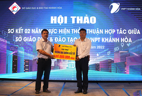 Dịp này, VNPT Khánh Hòa đã trao 100 triệu đồng cho Sở Giáo dục và Đào tạo triển khai hỗ trợ 25 trường học trên địa bàn tỉnh để xây dựng trường học không giấy tờ, góp phần chuyển đổi số tại các trường.