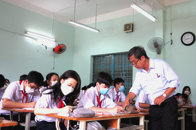 Thầy Trí hướng dẫn học sinh làm bài. |