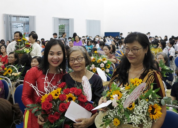 Dịp này, lãnh đạo nhà trường đã tặng hoa chúc mừng, tri ân các thầy cô giáo của trường đã nghỉ hưu. Những lẵng hoa do chính học sinh của các lớp trang trí để bày tỏ tình cảm đối với các thầy cô giáo.