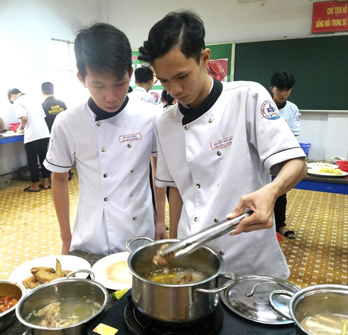 Học sinh Trường Trung cấp Kinh tế Khánh Hòa học thực hành chế biến món ăn. |