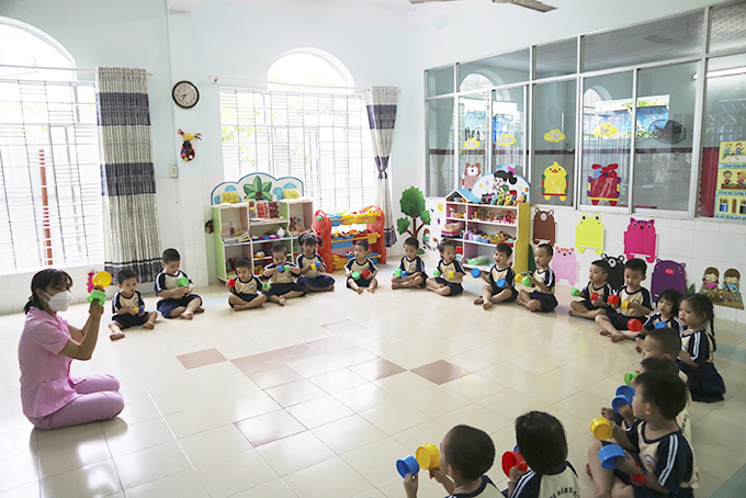 Từ ngày 1-4, Trường Mầm non 8-3 và Mầm non Tân Lập sáp nhập thành Mầm non Tân Lập 1. Trong ảnh: Cô và cháu Trường Mầm non 8-3. |