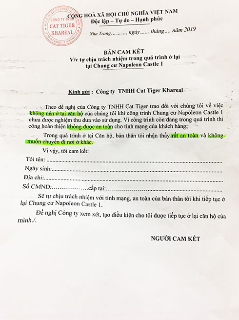 Mới đây, Công ty TNHH Tiger Khareal đã yêu cầu hơn 200 khách hàng đang sống tại dự án Chung cư Napoleon Casle 1 (25-26 Nguyễn Đình Chiểu, TP. Nha Trang) cam kết tự chịu trách nhiệm trong quá trình ở lại tại dự án này. Bản cam kết do Công ty TNHH Tiger Khareal soạn sẵn, đóng dấu treo, phát cho khách hàng để ghi đầy đủ họ tên và ký vào.