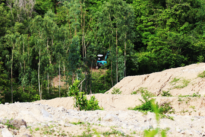 Nằm cách khu đất san ủi, phân lô bán nền của ông Nguyễn Đức Phán không xa (Báo Khánh Hòa đã nhiều lần phản ánh, đến nay UBND TP. Nha Trang đã thu hồi đất) là một khu đất cũng bị san ủi, làm biến dạng địa hình. Ngày 28-9, theo chân một người dân ở dưới chân núi, chúng tôi khá vất vả mới leo lên được khu vực san ủi. Trước mắt chúng tôi là hàng nghìn m2 đất rừng sản xuất đã bị san gạt. Chủ đất đã làm bờ kè dẫn từ chân núi lên, rồi tiếp tục san ủi lên gần đỉnh ngọn núi này. Quan sát phía trên đỉnh núi, chúng tôi phát hiện có một máy múc vẫn miệt mài làm việc.