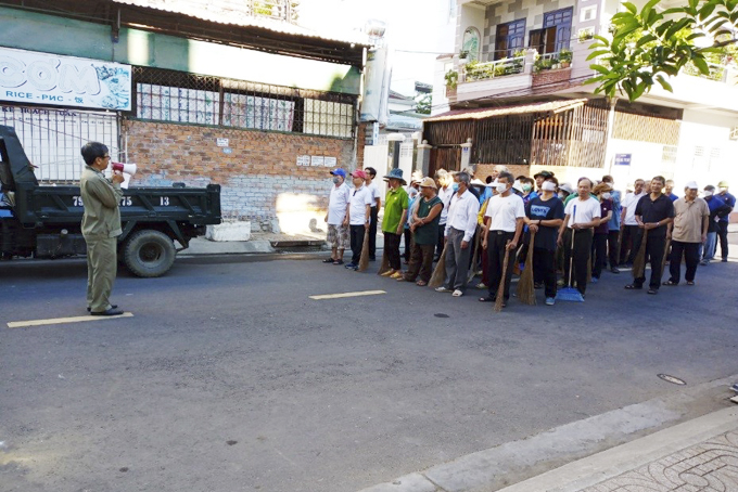 Các cựu chiến binh tổ 2 Đông Nam tham gia dọn vệ sinh môi trường. |