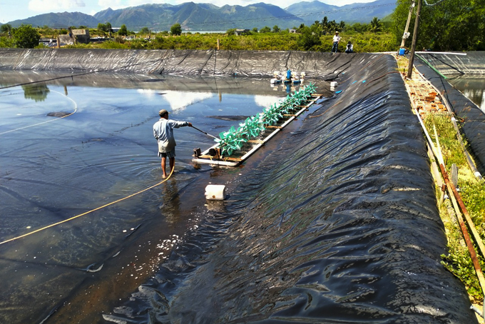 Khử trùng, xử lý ao nuôi tại cơ sở nuôi của ông Lê Minh Chính. |