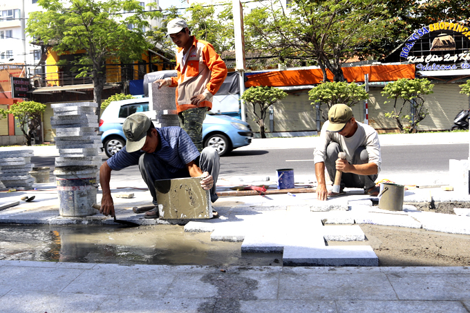 Công nhân đang thay thế gạch trên vỉa hè đường Trần Phú. |