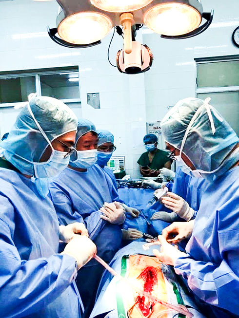 Các chuyên gia thực hiện ca phẫu thuật cột sống tại Bệnh viện Đa khoa tỉnh. |