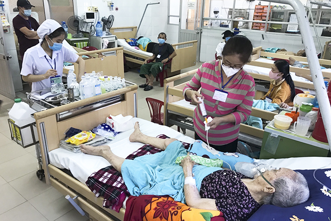 Khoa Nội tim mạch lão học, BVĐK tỉnh là một trong những khoa có rất nhiều người lớn tuổi, hầu hết các BN điều trị tại khoa đều có bệnh lý nền đi kèm như: Tăng huyết áp, đái tháo đường, tim mạch… Đây là nhóm BN có sức đề kháng yếu, nguy cơ lây nhiễm dịch bệnh rất cao. Ngay từ đầu tháng 8, khoa đã triển khai quyết liệt các giải pháp phòng bệnh như: Tại cổng ra vào của khoa có bố trí lực lượng đo thân nhiệt; yêu cầu người nhà và BN đeo khẩu trang thường xuyên; tăng cường vệ sinh các buồng bệnh (2 - 3 lần/ngày); tăng gấp đôi lượng chai sát khuẩn tay đặt ở hành lang và trong buồng bệnh…