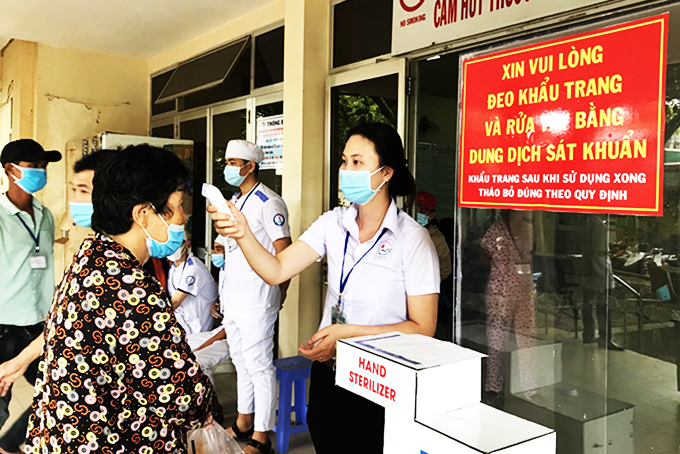 Khi tình hình dịch bệnh ở Đà Nẵng ngày càng phức tạp, giữa tháng 7, BV Đa khoa tỉnh đã phục hồi lại việc phân luồng, giám sát các ca bệnh ngay từ các cổng ra, vào BV. Tại 4 cổng chính, đều có nhân viên y tế đo thân nhiệt và nhắc nhở những người vào khám, điều trị, tới BV làm việc phải đeo khẩu trang, rửa tay với dung dịch sát khuẩn được đặt tại các điểm sàng lọc này. Sau khi khám sàng lọc, những bệnh nhân (BN) nào có dấu hiệu của bệnh hô hấp đều được hướng dẫn đến phòng khám hô hấp đặt ngay tại cổng số 2. Qua khám, nếu phát hiện BN có dấu hiệu nghi ngờ nhiễm Covid-19 sẽ được chuyển thẳng vào khu cách ly đặt ngay tại đây nhằm hạn chế thấp nhất tình trạng di chuyển BN. Ở những khu vực chờ khám, những nơi tập trung đông người, hành lang và các buồng đều có bảng tuyên truyền về phòng bệnh Covid-19, hướng dẫn người đến khám giãn cách tối thiểu 1m; bố trí các chai sát khuẩn tay để người nhà và BN thuận tiện vệ sinh tay; cấm xe đưa đón BN vào BV…
