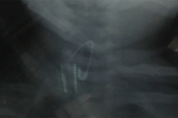 Bệnh nhi T.L.N.K. (18 tháng tuổi, TP. Nha Trang) nhập viện ngày 28-3 trong tình trạng đau họng, khóc nhiều, không ăn uống được, ói liên tục. Qua thăm khám và chụp X-quang, y, bác sĩ của bệnh viện phát hiện có một kim băng bị bung mở phần đầu cắm vào thành thực quản của bệnh nhi. Ngay sau đó, Khoa Ngoại Tổng quát của bệnh viện đã sử dụng các dụng cụ chuyên dụng tiến hành nội soi cấp cứu gắp dị vật cho bệnh nhi K. Dị vật được gắp ra là kim băng màu vàng, dài khoảng 1,5cm. Bác sĩ Cáp Thị Thu Thủy - phòng Nội soi, người thực hiện gắp chính cho biết: “Những trường hợp như trên nếu đưa vào trễ, dị vật có thể gây thủng thực quản, khí quản dẫn tới tình trạng chảy máu, tràn khí. Thời gian lâu gây hoại tử, loét tại chỗ và gây nguy hiểm tới tính mạng của trẻ”.