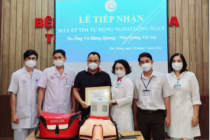 Ngày 13-5, gia đình ông Võ Đăng Quang (TP. Nha Trang) trao tặng máy ép tim tự động ngoài lồng ngực cho Bệnh viện Đa khoa tỉnh Khánh Hòa. Máy này giúp bác sĩ đảm bảo tần suất và độ sâu của lồng ngực khi ép để kích thích tim đập lại.Tổng trị giá của máy hơn 350 triệu đồng. Sau khi tiếp nhận máy được chuyển về cho Khoa Hồi sức tích cực - Chống độc của bệnh viện để điều trị cho những trường hợp bị ngưng tim, ngưng thở, nhất là đối với những bệnh nhân bị điện giật, đuối nước. Đây là máy ép tim ngoài lồng ngực đầu tiên của bệnh viện.