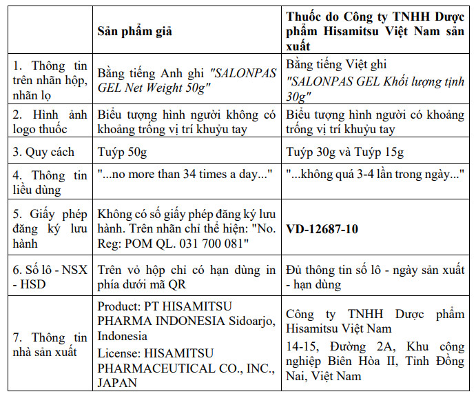 Sở Y tế Khánh Hòa cho biết vừa nhận được công văn của Cục Quản lý Dược thông báo về thuốc giả Salonpas Gel; trên nhãn ghi "Salonpas Gel Net Weight 50g, Product: PT HISAMITSU PHARMA INDONESIA Sidoarjo, Indonesia, No. Reg: POM QL. 031 700 081", kèm các thông tin về nhãn, thông tin tra cứu trên internet.