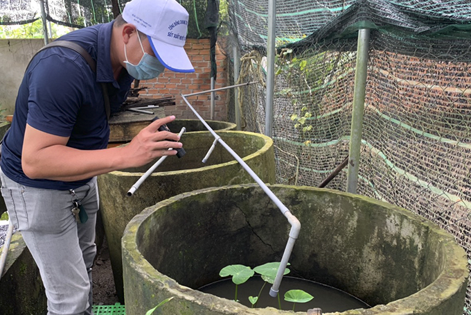 Kiểm tra dụng cụ chứa nước ở hộ dân huyện Khánh Vĩnh.